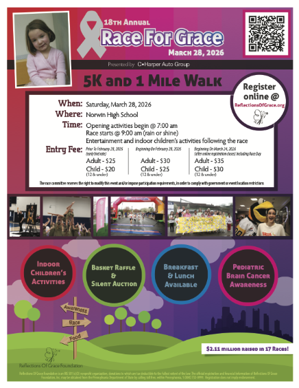 Can’t attend the event but still want to help? Simply go to https://reflectionsofgracefoundation.givingfuel.com/crowd/18thraceforgrace-donation-fundraising-page and make a donation or create your own fundraising page. Your contribution will enable the Reflections Of Grace Foundation to support families with love, give children hope, and fight pediatric brain cancer with grace.Donate Monthly